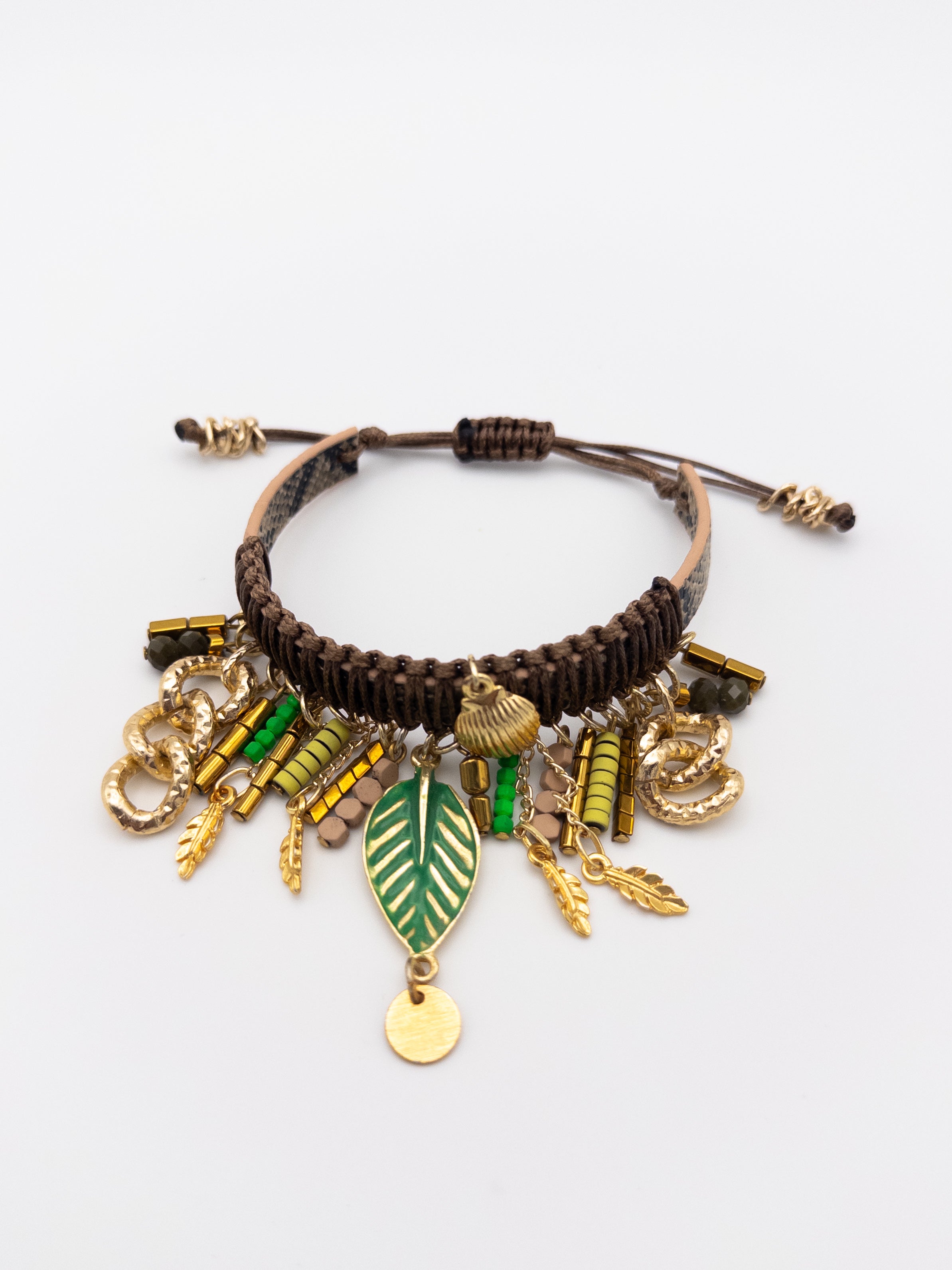 - Handwoven brown macramé band for a comfortable, adjustable fit