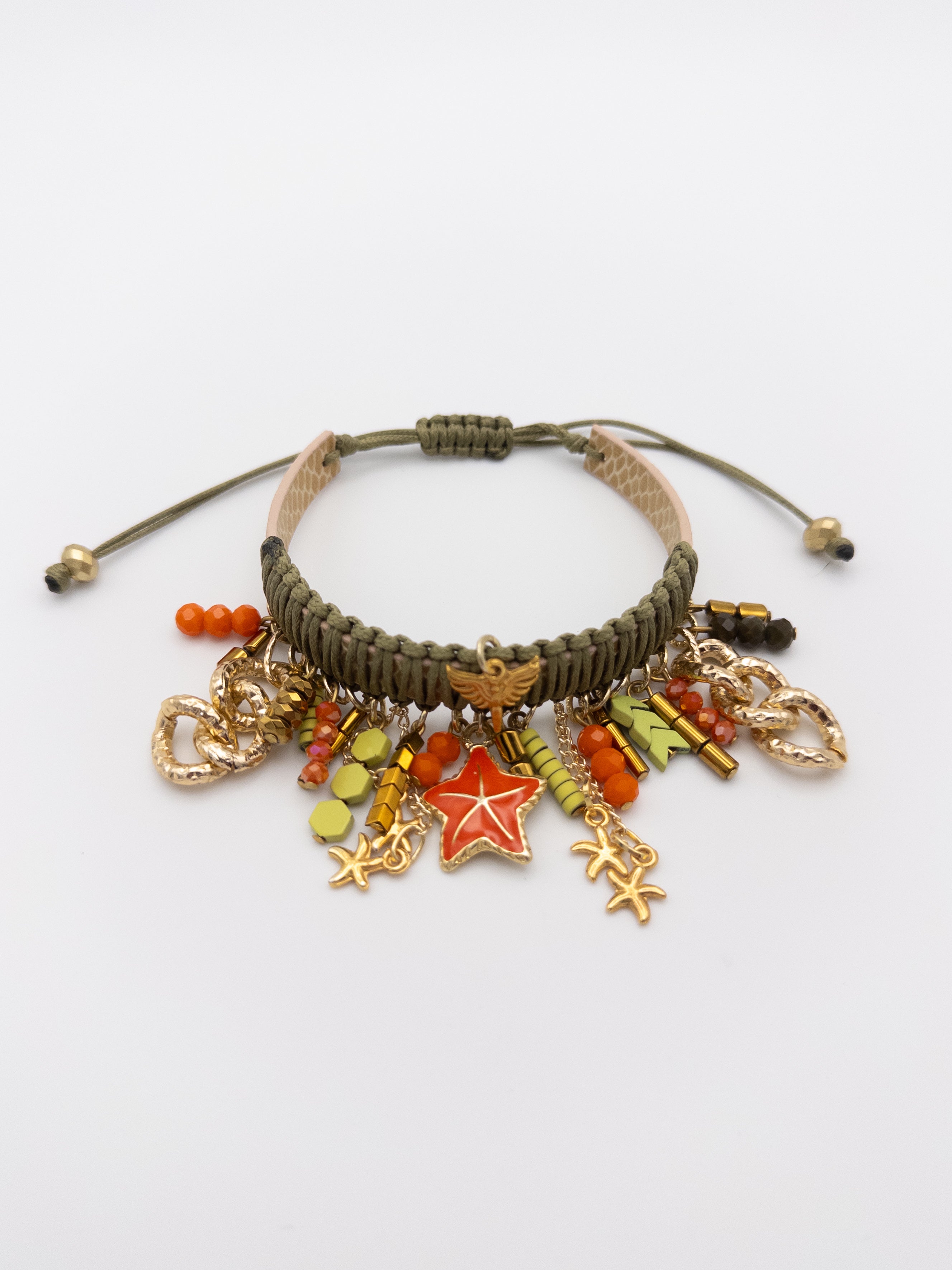 Embrace earthy elegance and ocean-inspired charm with this handcrafted olive green macramé anklet, designed for those who love nature-inspired accessories with a bold twist. Featuring gold-tone charms, vibrant orange and lime beads, and a stunning red starfish pendant, this anklet is a perfect blend of adventure and sophistication.