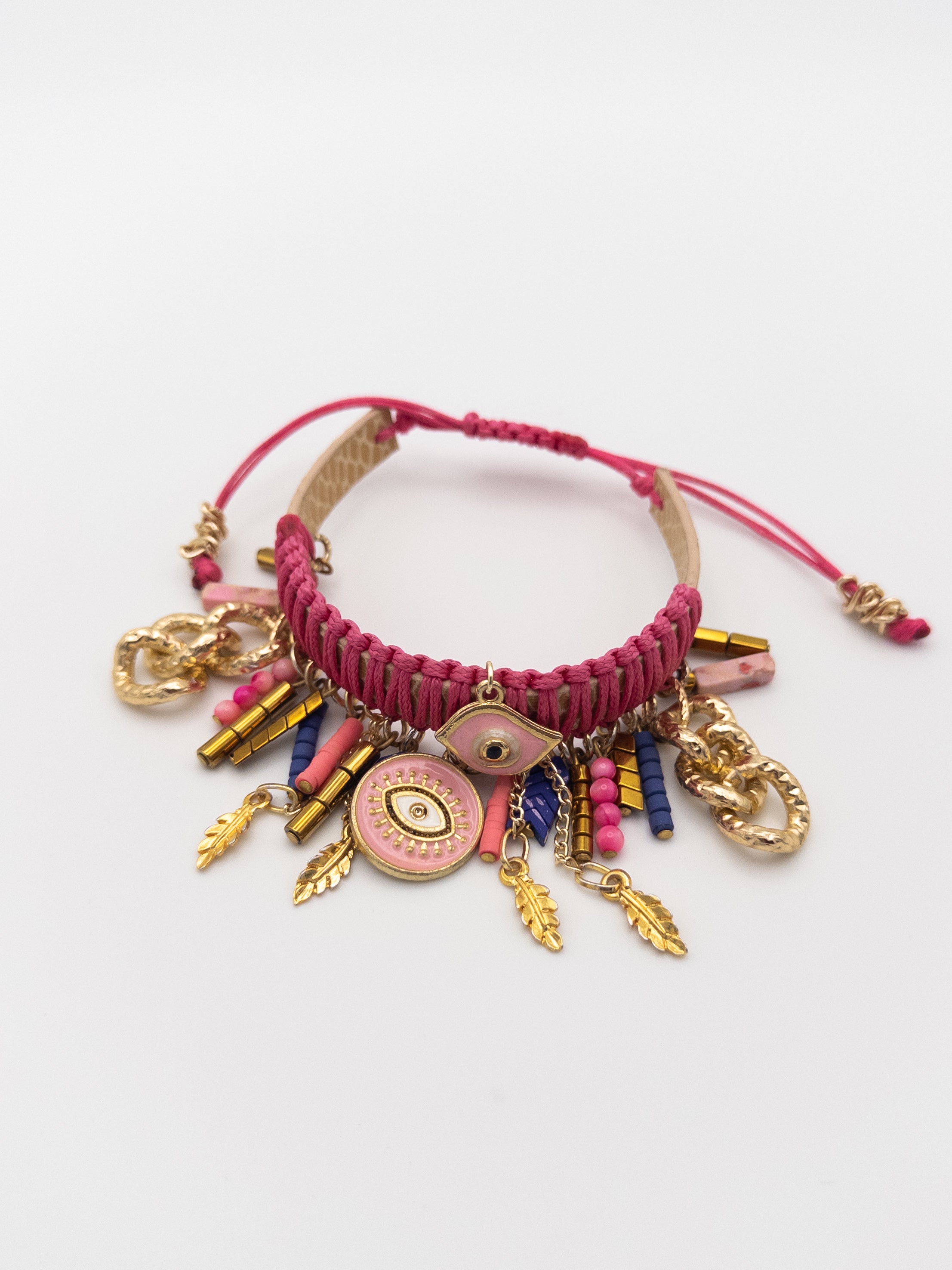 Make a bold statement with this handcrafted fuchsia macramé anklet, an eye-catching fusion of bohemian charm and modern elegance. Adorned with gold-tone charms, navy and pink beads, and a striking lilac evil eye pendant, this anklet is designed for those who love unique and meaningful accessories.