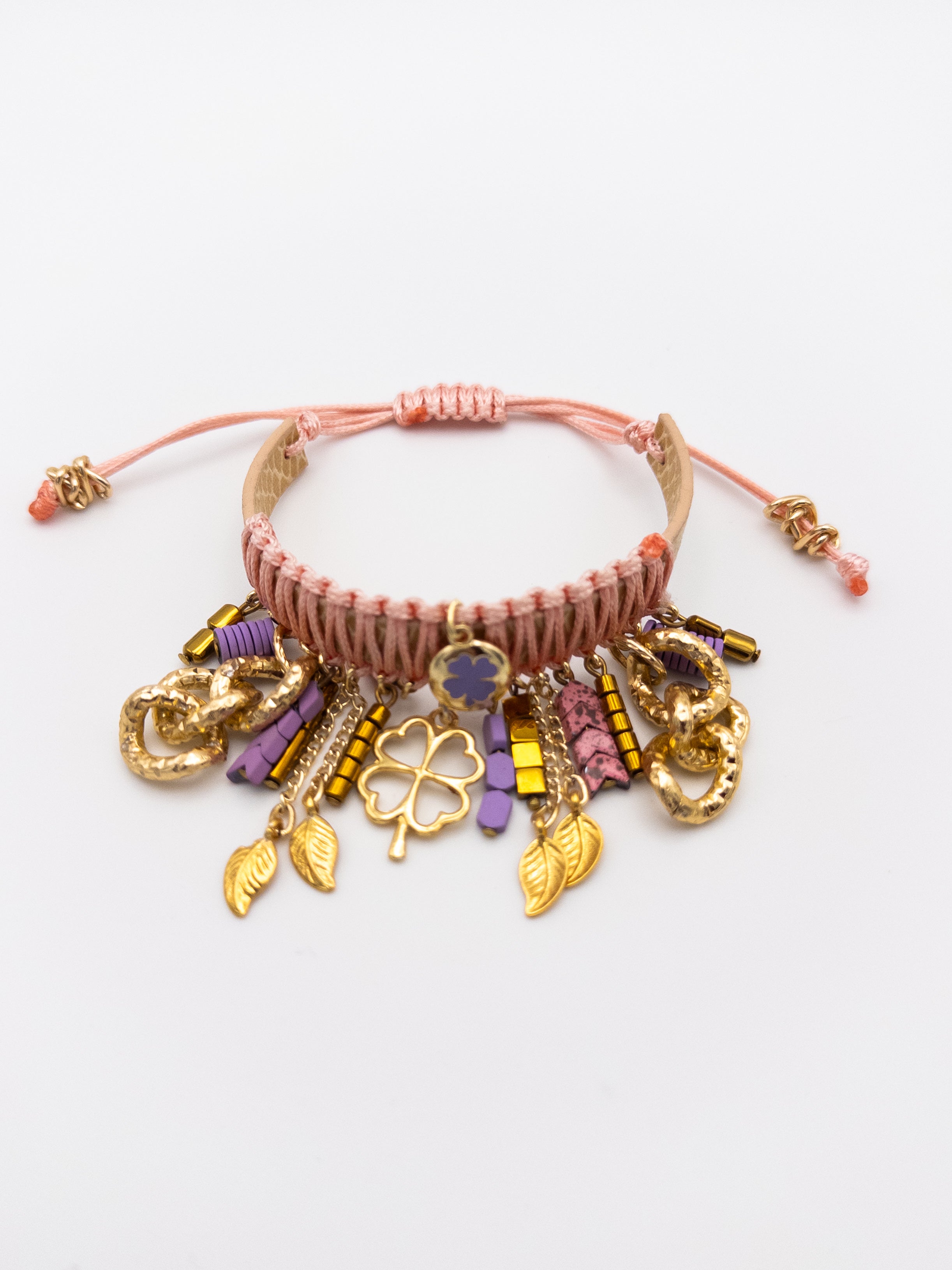 Delicate yet bold, this handcrafted blush pink macramé anklet is a charming fusion of elegance and bohemian spirit. Embellished with gold-tone charms, lilac and gold beads, and intricate leaf details, this anklet is designed to add a touch of romance and sophistication to your look. The lucky clover pendant serves as a symbol of positivity and fortune, making this piece as meaningful as it is beautiful.