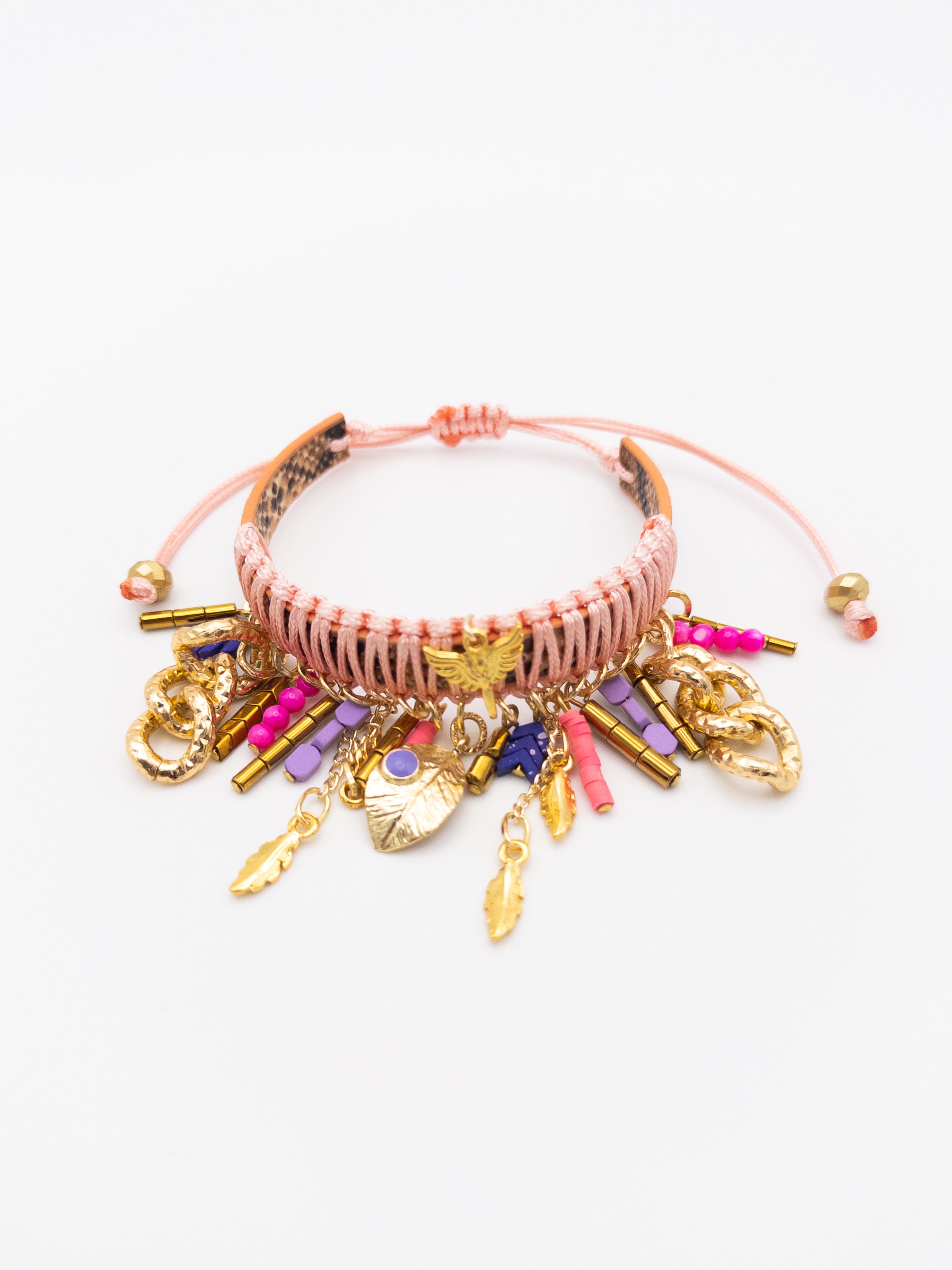 Delicate yet bold, this handcrafted blush pink macramé anklet is a charming fusion of elegance and bohemian spirit. Embellished with gold-tone charms, lilac and gold beads, and intricate leaf details, this anklet is designed to add a touch of romance and sophistication to your look. The lucky clover pendant serves as a symbol of positivity and fortune, making this piece as meaningful as it is beautiful.
