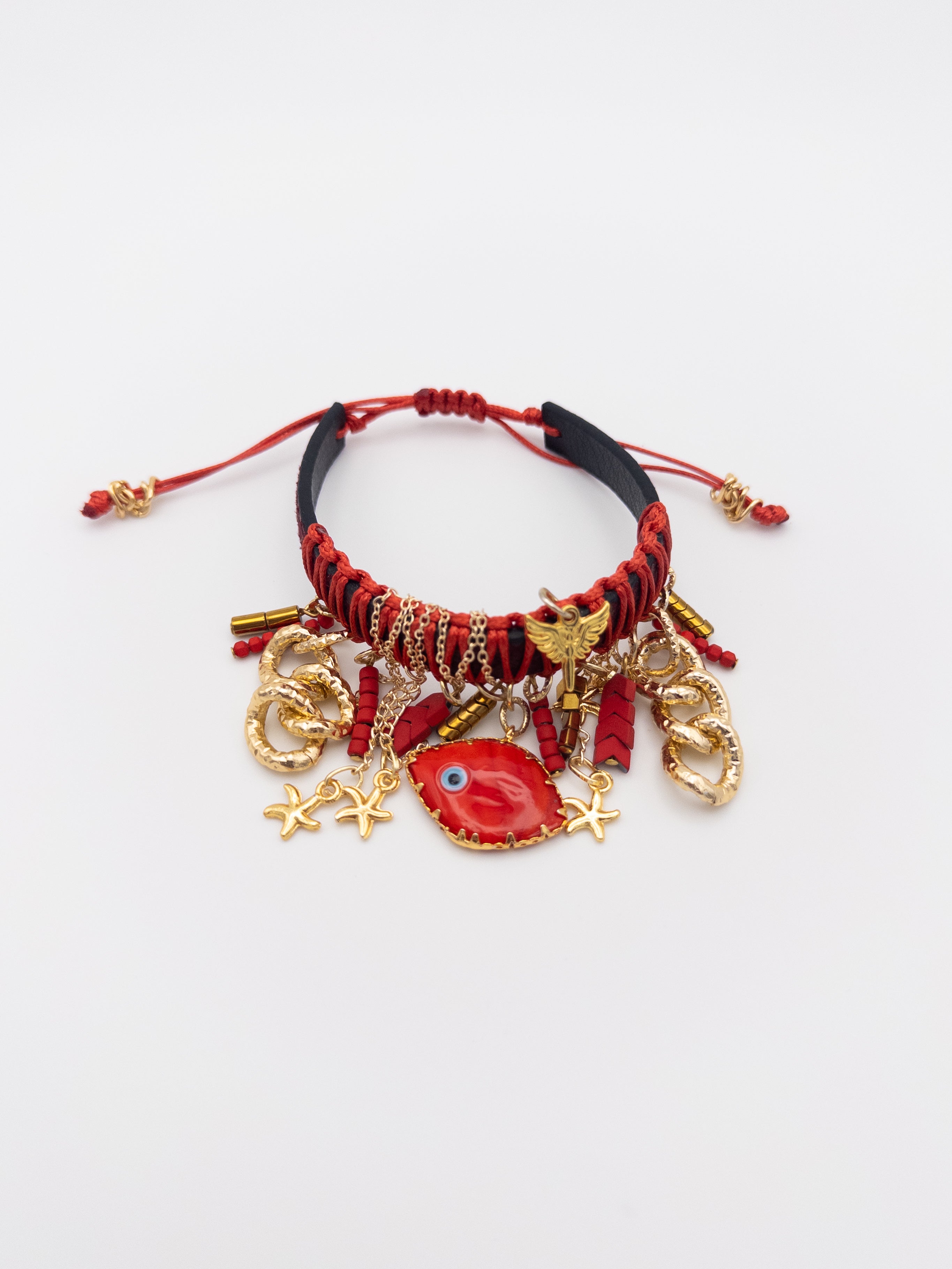 Unleash your inner boldness and elegance with this handcrafted red macramé anklet, featuring gold-tone charms, deep red beads, and a striking red evil eye pendant for a touch of protection and style. This anklet is the perfect blend of fierce energy and refined bohemian charm, making it a standout accessory for any occasion.
