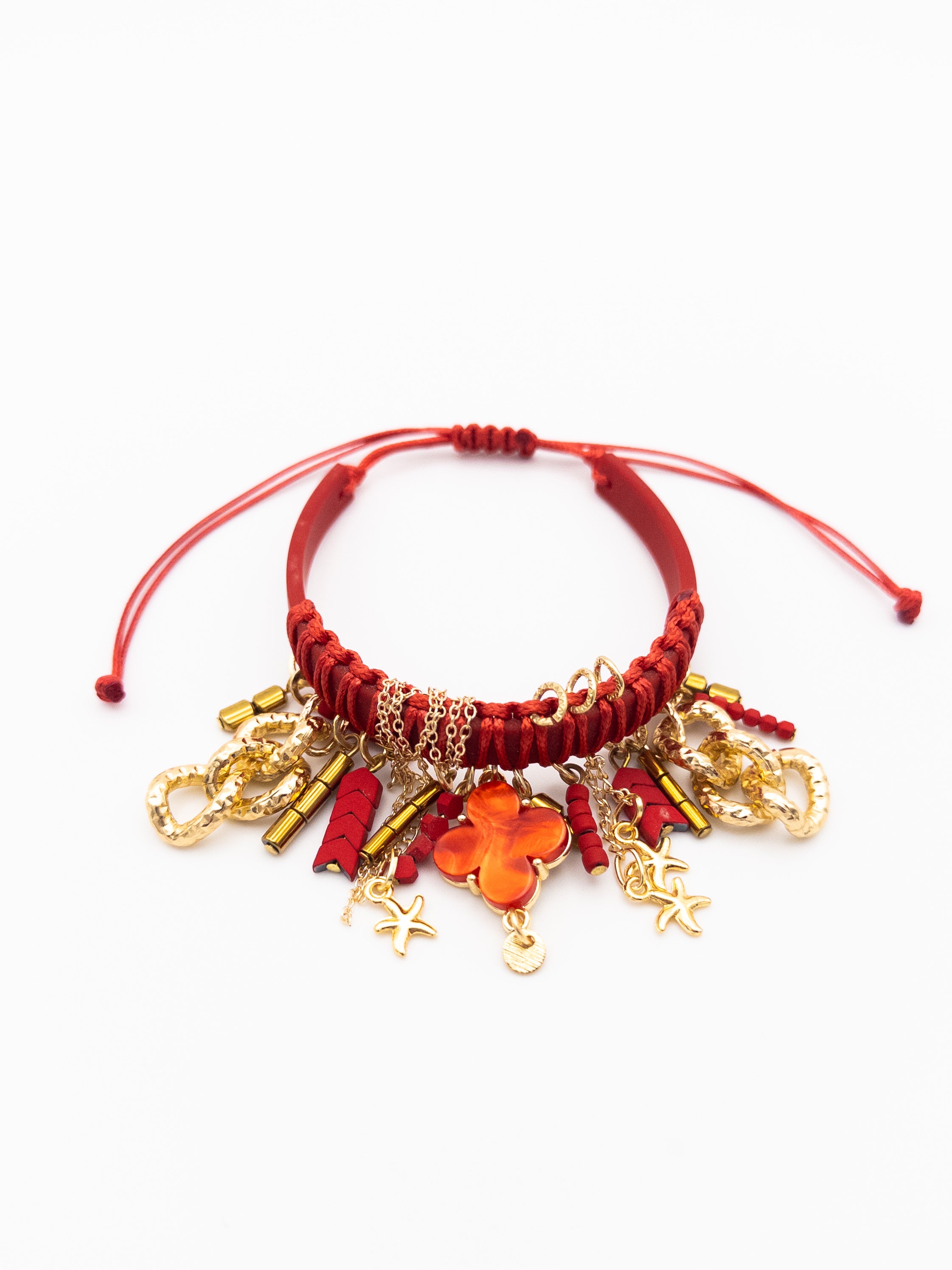 • Gold-tone charms, including starfish, textured chains, and a radiant orange clover pendant
