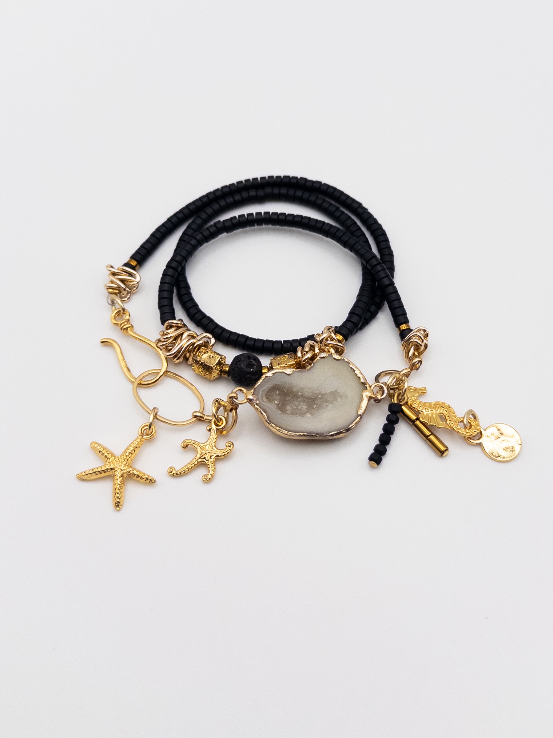 Designed with a black cord, the second wrap features volcanic stones and aluminum elements, while multiple starfish charms add an ocean-inspired elegance. A truly unique, handcrafted statement piece.