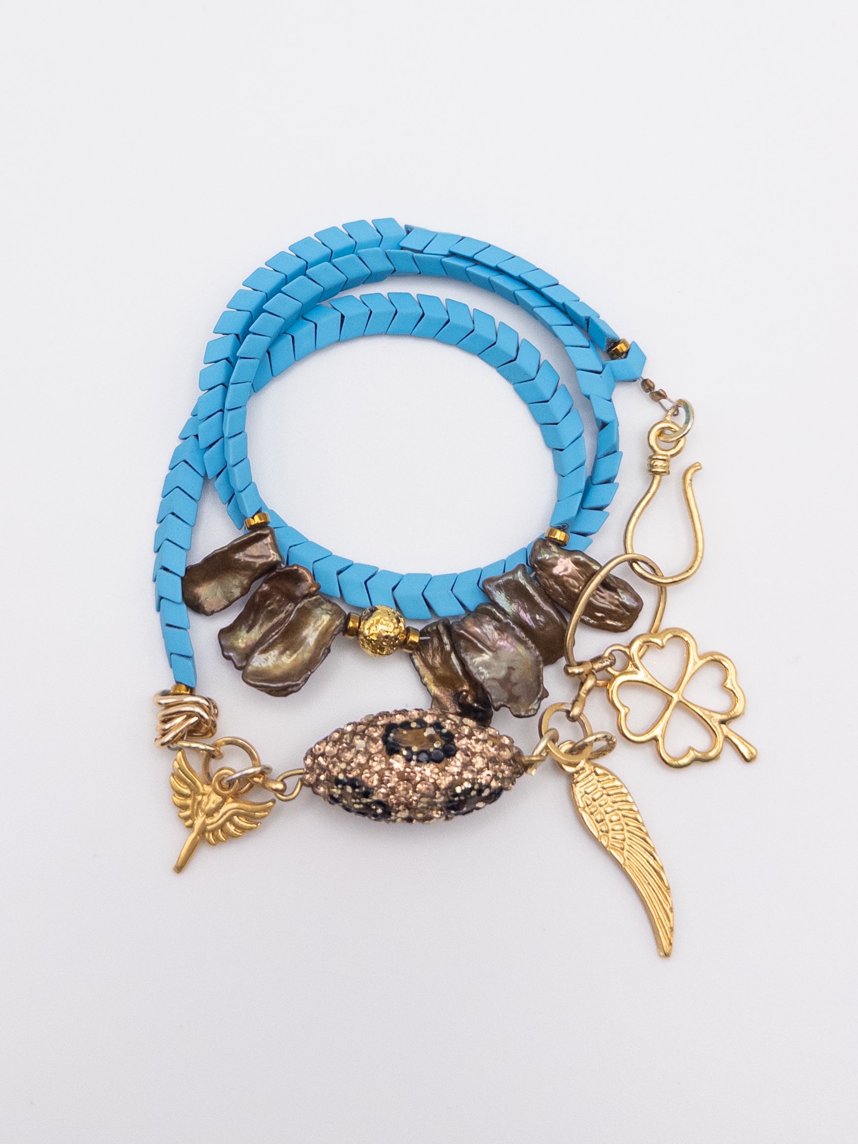 This three-wrap bracelet can also be styled as an asymmetric necklace.