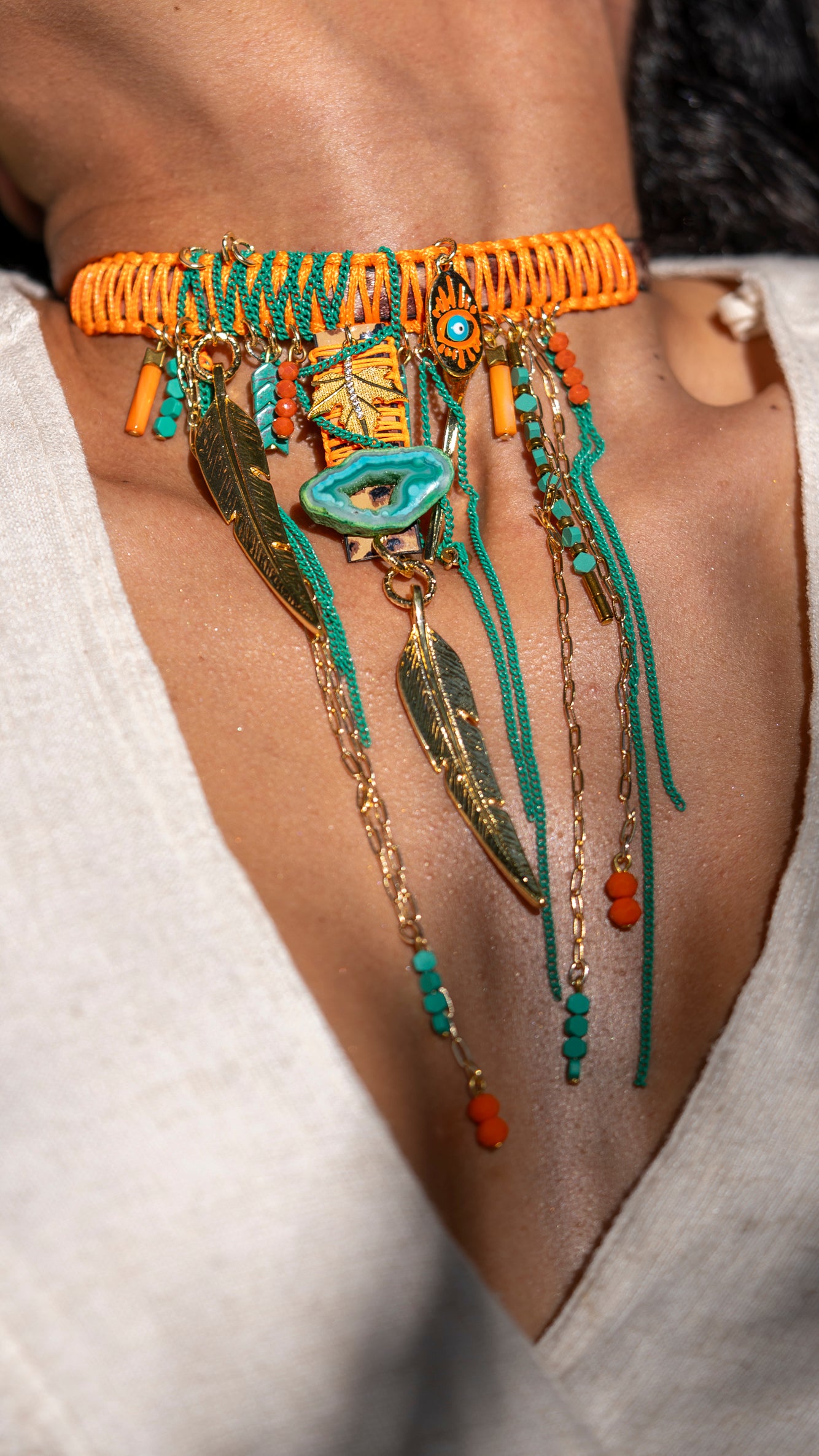 Our Energy Burst chokers are designed to make a bold statement! The base cord is crafted from leather, with intricate macrame weaving in vibrant orange parachute cord. To enhance the visual impact, a green chain is interwoven into the macrame, adding depth and texture.