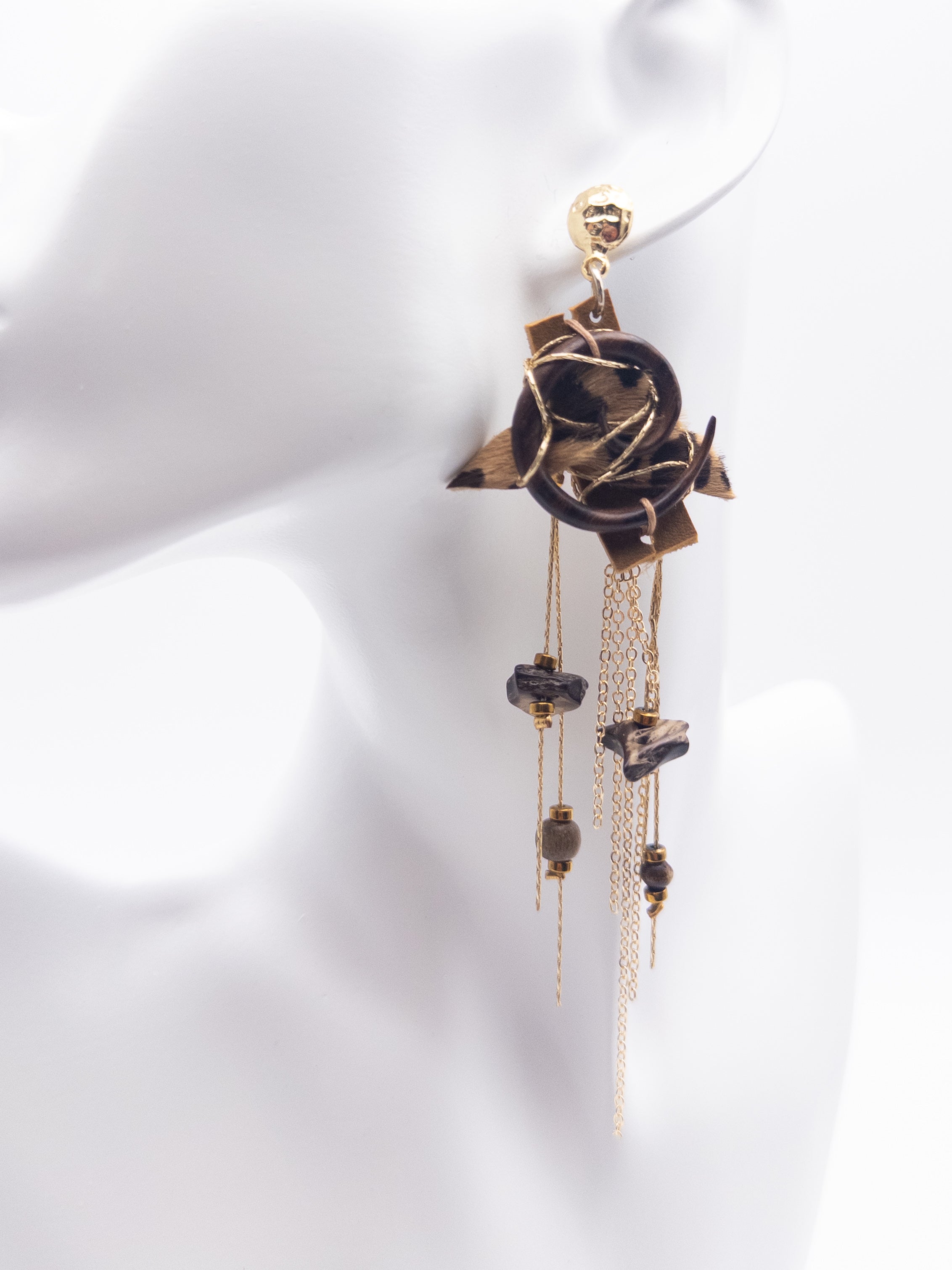 This lightweight statement earring features leopard-print leather and a teakwood amulet for a unique touch.