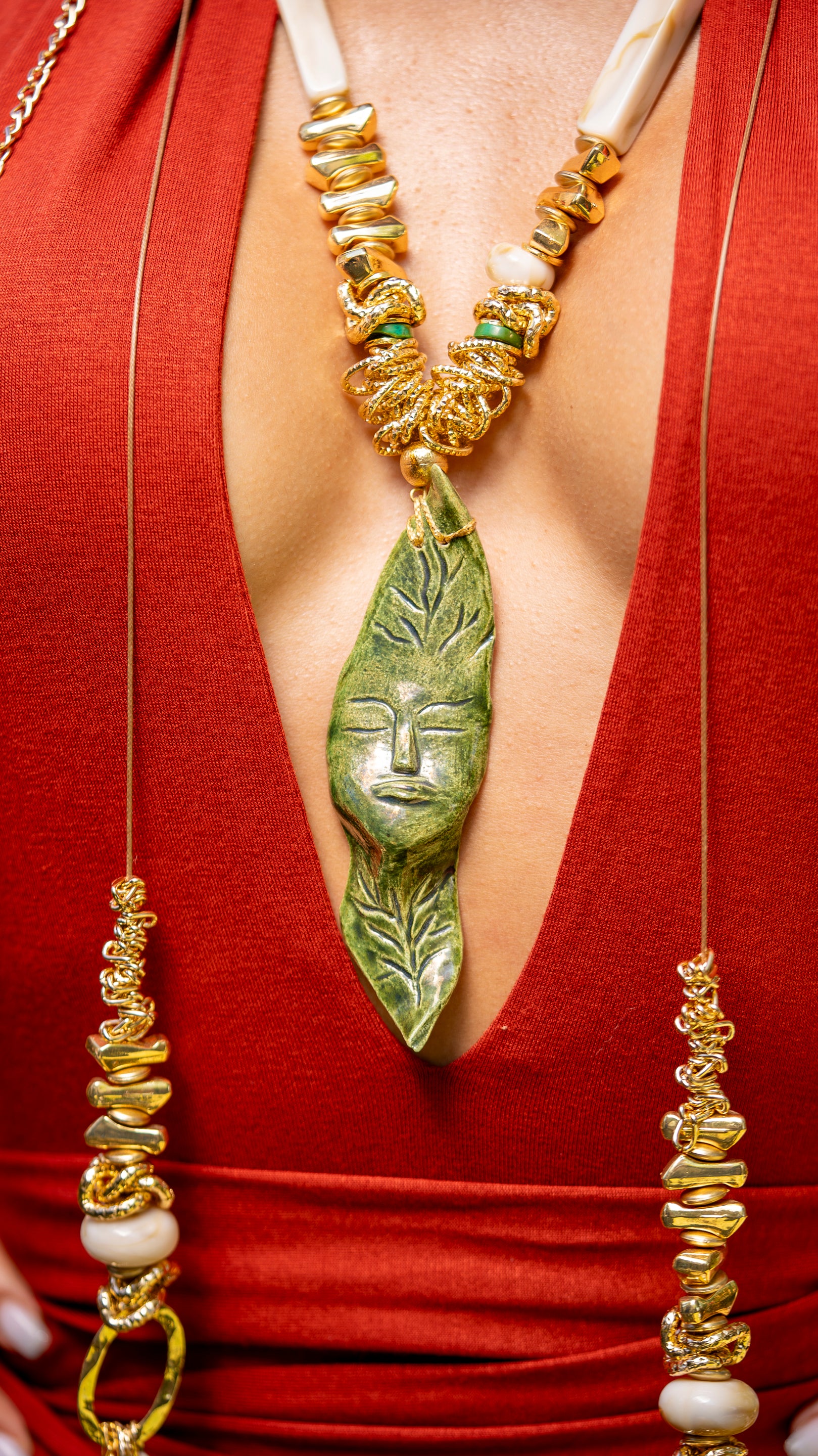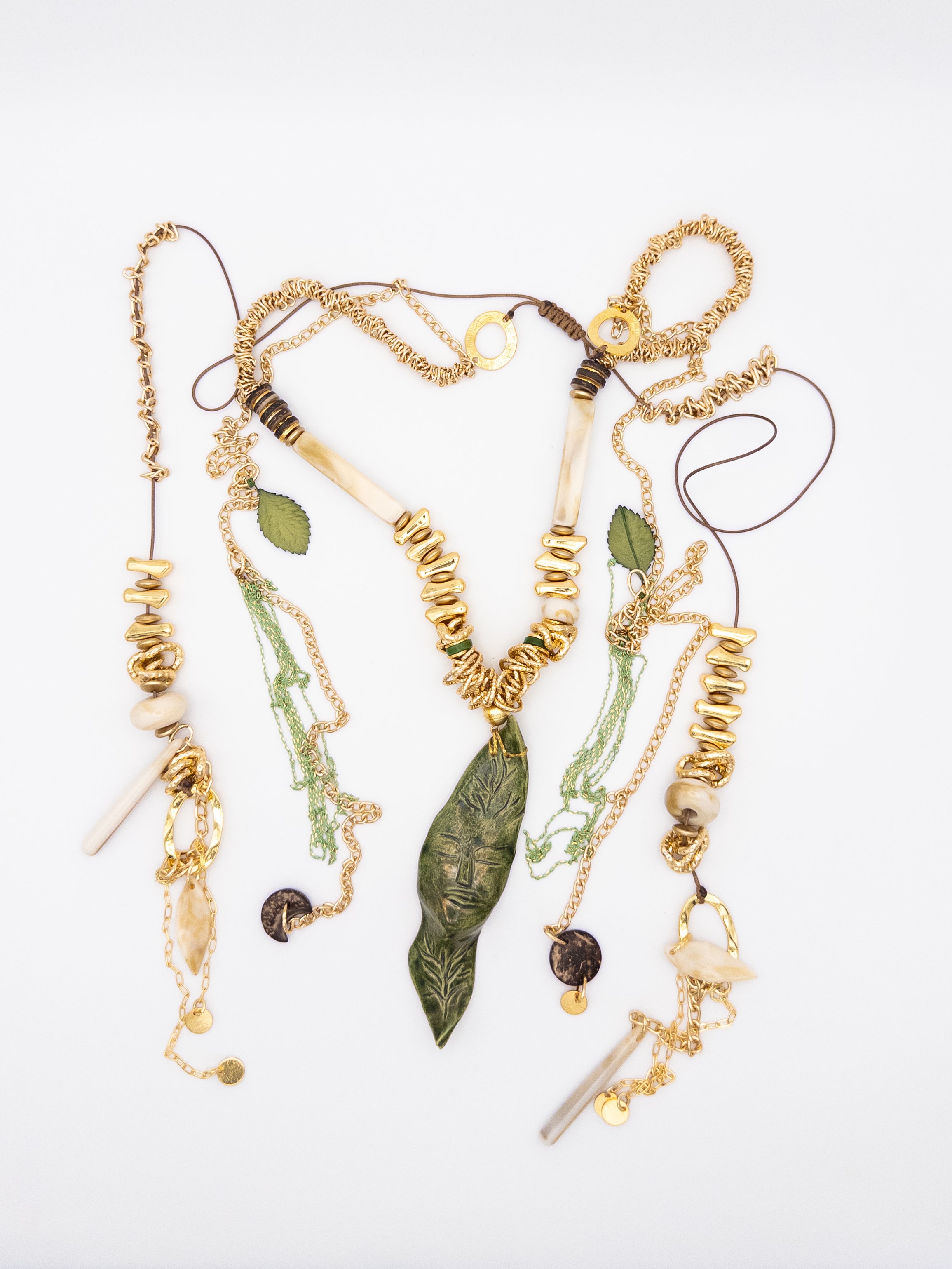 This artistic and nature-inspired necklace blends textures, materials, and craftsmanship into a truly wearable piece of art.