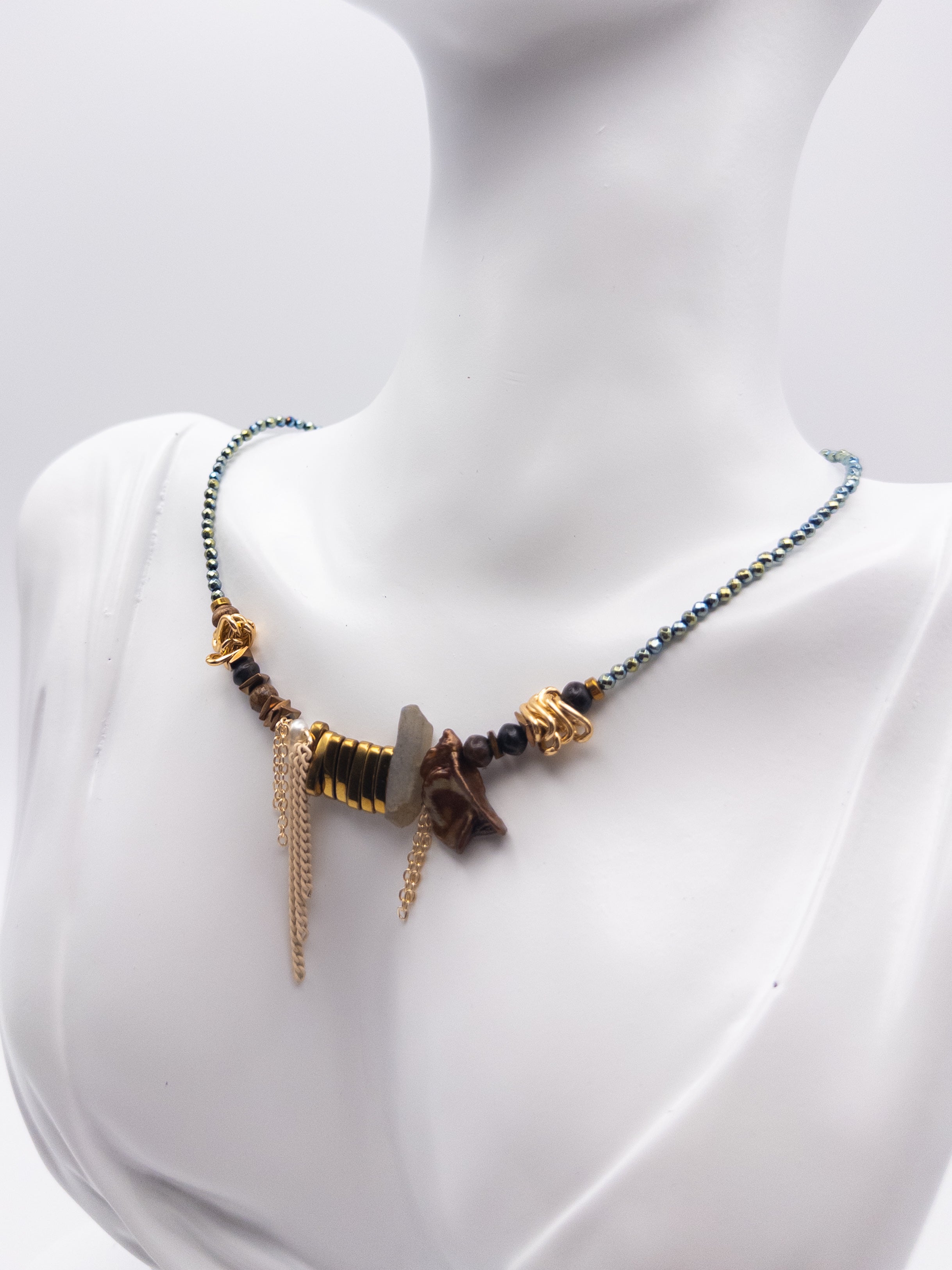 Our delicate necklace features a cord made of hematite stones, adorned with wooden beads at the front, vibrant genuine pearls, a natural greenish labradorite stone, and a central metal charm. A unique blend of natural elements and elegance.