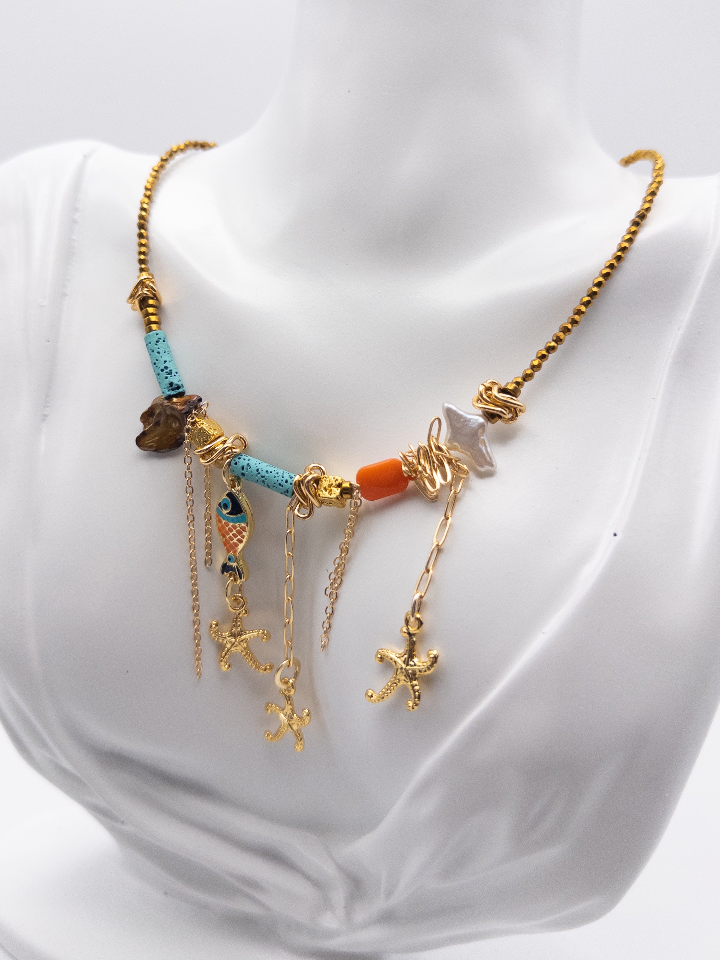The cord is made of natural hematite stones, featuring a volcanic stone shaped like a sergeant rank, hematite pieces, two elongated turquoise beads, aluminum elements, pearls, an enamel-painted fish charm, and dangling starfish charms with chains.
