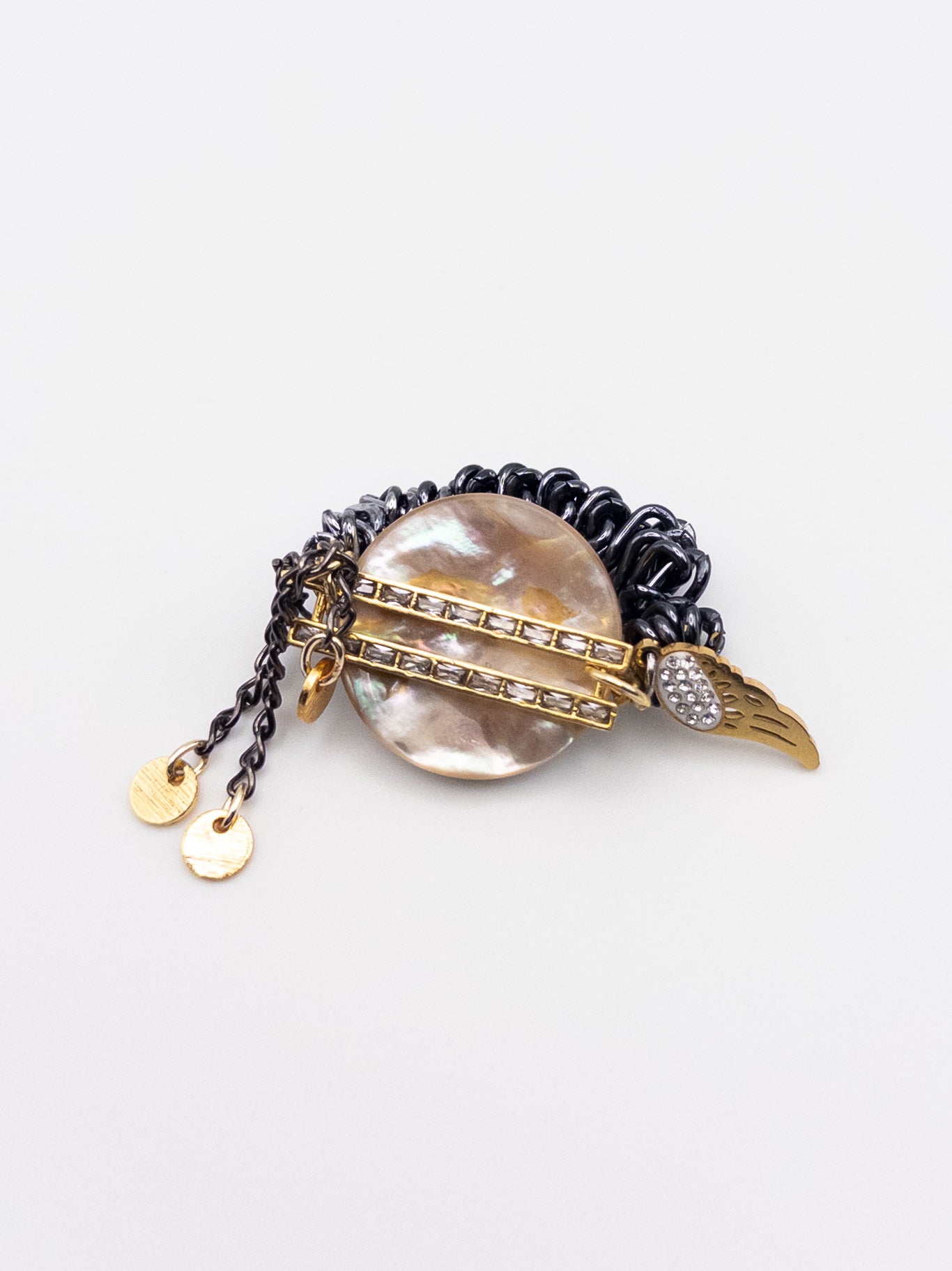 Two parallel golden bars adorned with crystals cross over the pearl, symbolizing balance and cosmic harmony. A delicate gold wing charm, encrusted with shimmering stones, adds an element of grace and freedom, while gold and black chain accents with small discs bring movement and depth.