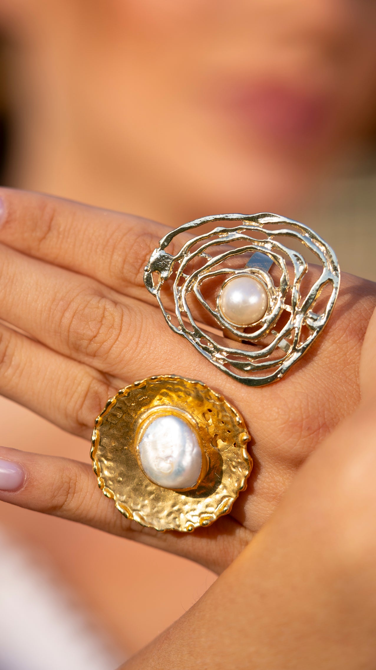 At its core, a luminous pearl is delicately set, representing the moon at the heart of a cosmic dance. The abstract, sculptural frame wraps around it, forming an ethereal and modern aesthetic. With its balance of delicate elegance and bold design, ORBIT is perfect for those drawn to mysticism, artistry, and celestial beauty.