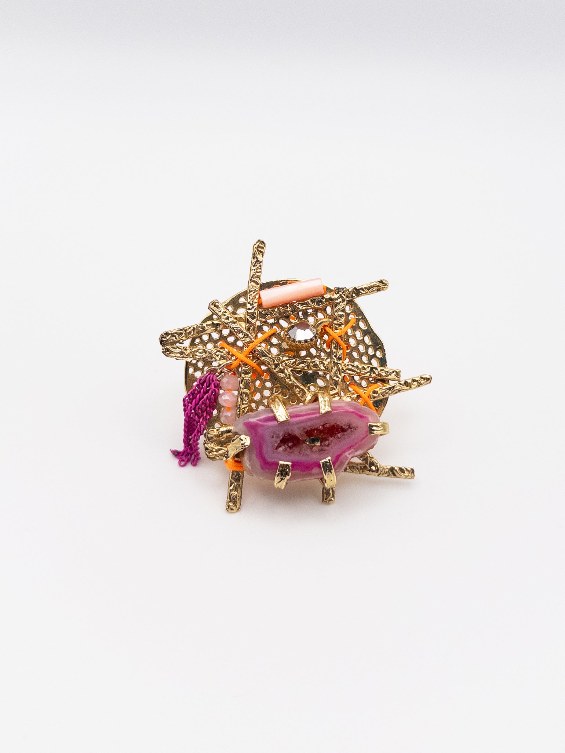 The SOLARA ring is a radiant, one-of-a-kind statement piece that embodies energy, vibrancy, and artistic expression. Its intricate gold-toned metal base features an openwork design, creating a delicate yet bold structure. At the center, a stunning pink agate geode is encased in a sculptural prong setting, showcasing its raw, crystalline beauty.