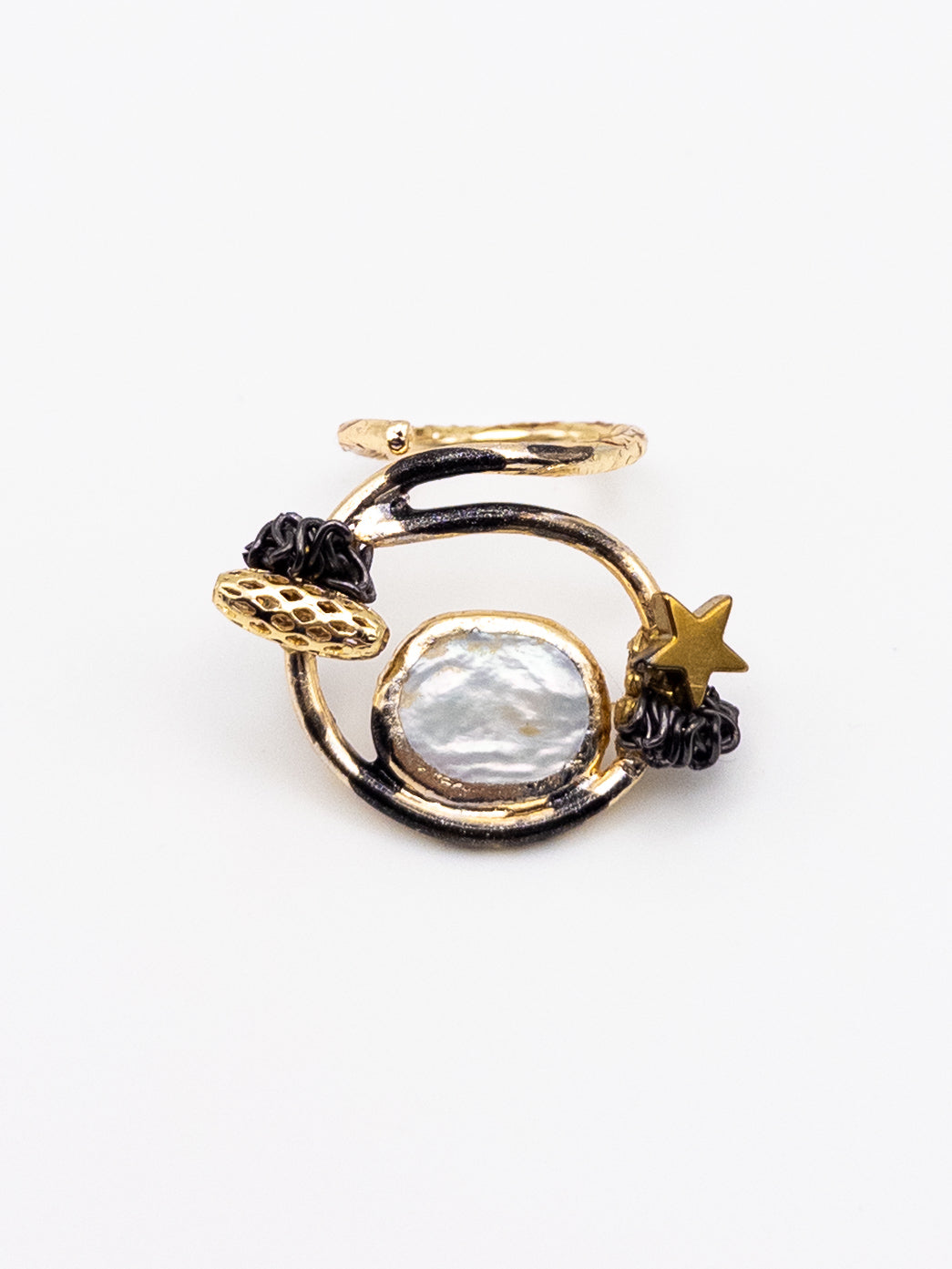 The STELLAR ring is a celestial masterpiece, capturing the mystical beauty of the universe in a one-of-a-kind design. Its open circular structure, crafted from gold and black-toned metal, represents the infinite cycle of the cosmos, blending elegance with a touch of mystery.
