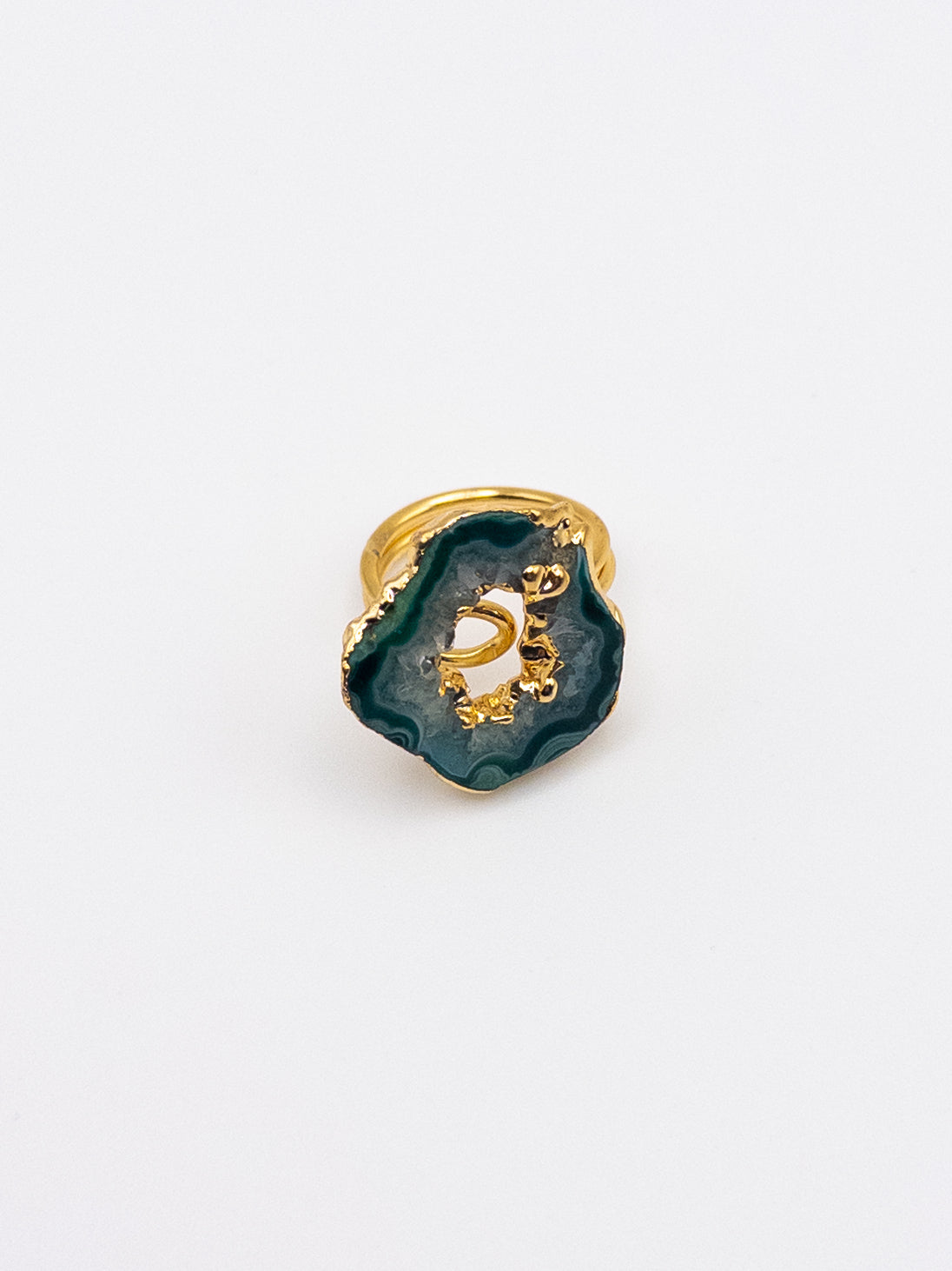 The VERTA ring is a one-of-a-kind statement piece inspired by the raw beauty of nature and the strength of transformation. At its core, a mesmerizing green agate geode with intricate natural banding and an open center is set in a gold-plated bezel, highlighting the organic, untouched beauty of the stone.
