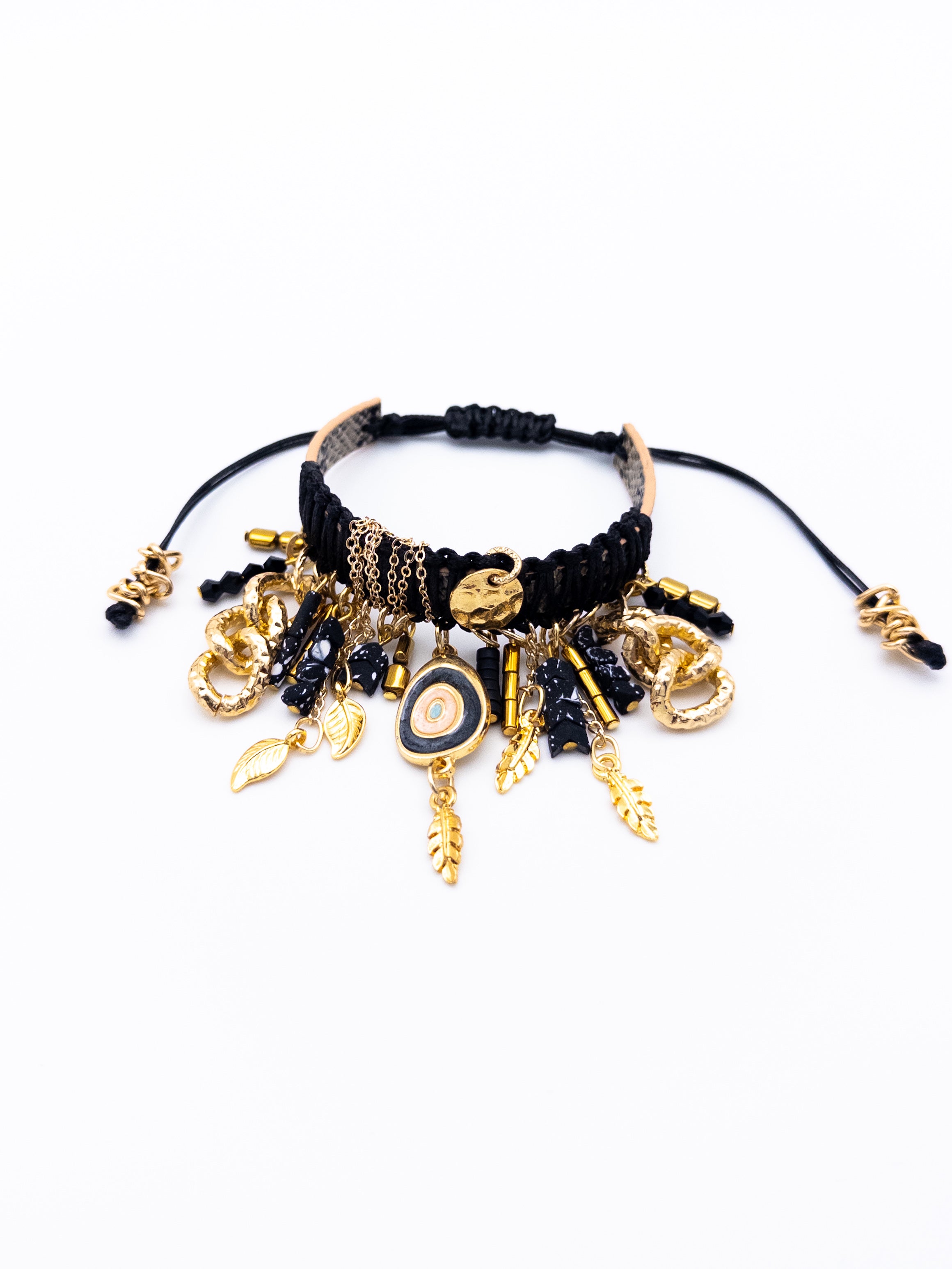 Add a touch of bold elegance to your style with this handcrafted black macramé anklet, adorned with luxurious gold-tone charms and intricate black and gold accents. Designed for those who love statement accessories, this anklet blends bohemian charm with a sophisticated edge, making it the perfect addition to any outfit.