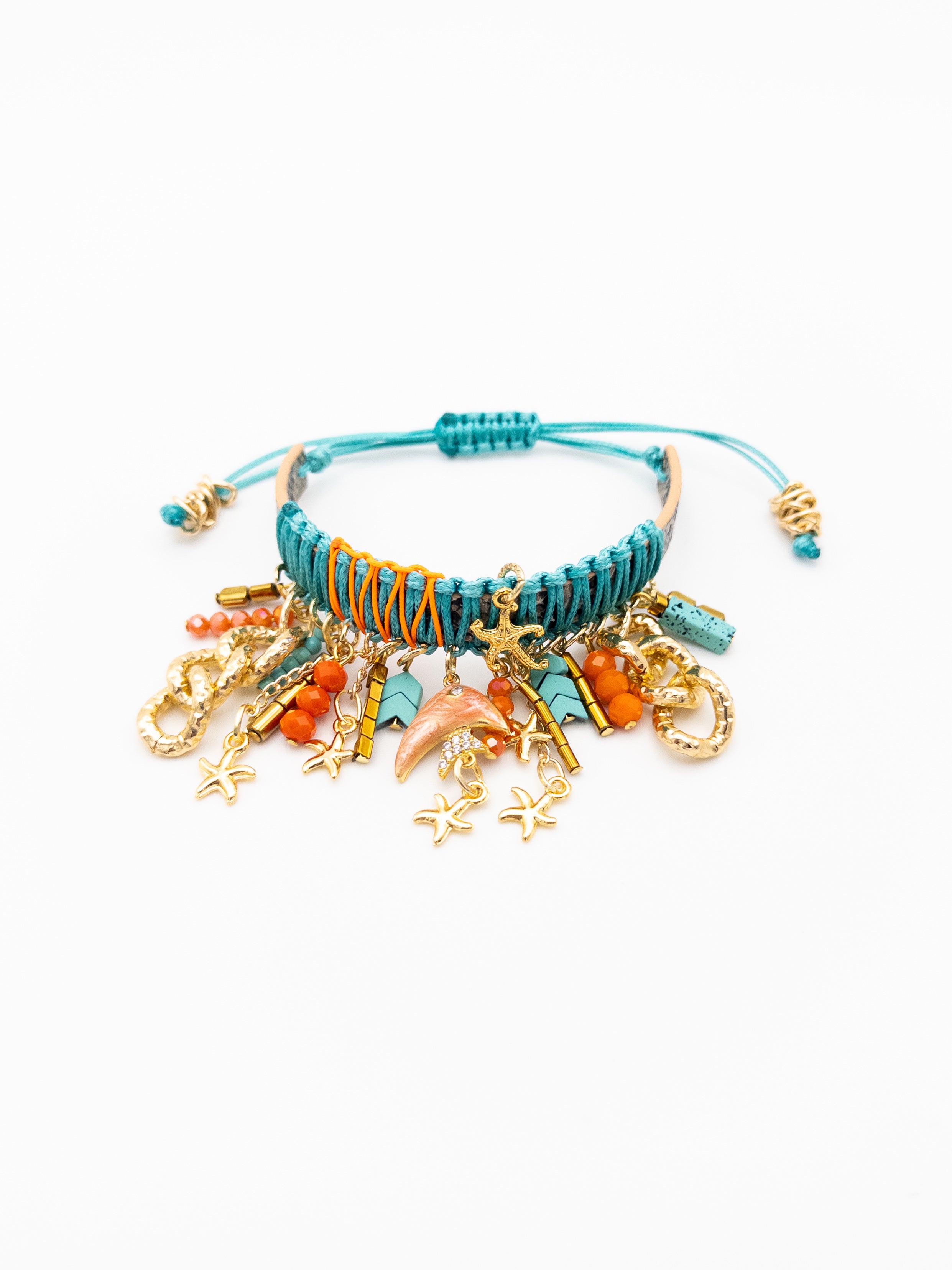 Infuse your style with bohemian energy and playful elegance with this handcrafted turquoise macramé anklet, featuring a stunning mix of gold-tone charms, colorful beads, and statement details. With its vivid orange and turquoise hues, this anklet is perfect for those who love bold, artistic accessories that stand out.