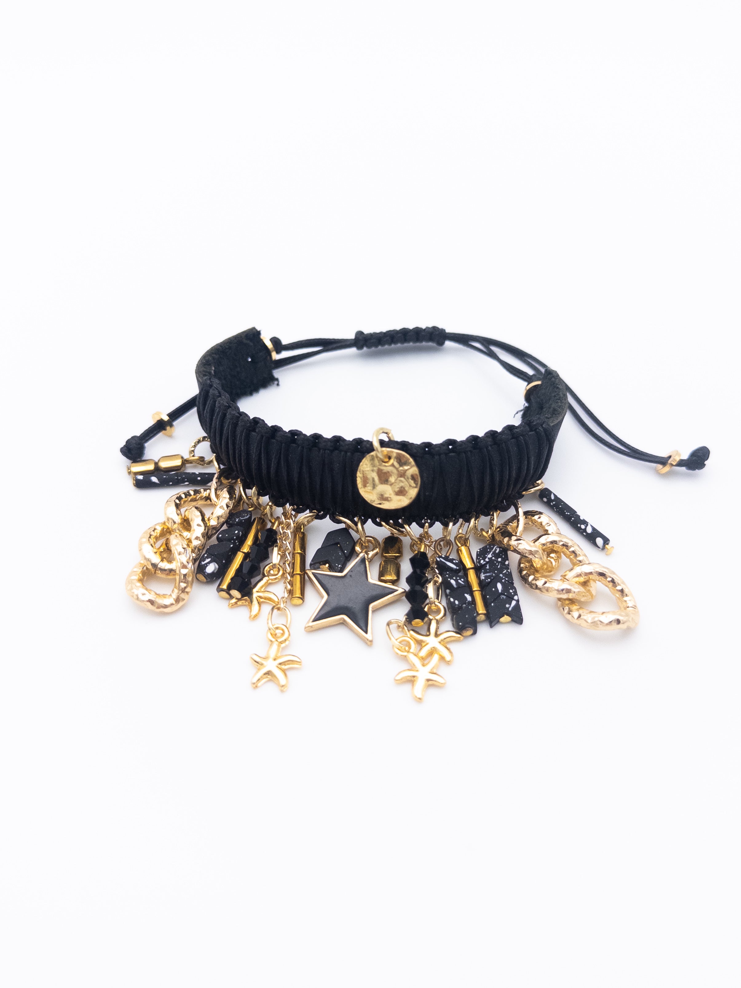 Add a touch of bold elegance to your style with this handcrafted black macramé anklet, adorned with luxurious gold-tone charms and intricate black and gold accents. Designed for those who love statement accessories, this anklet blends bohemian charm with a sophisticated edge, making it the perfect addition to any outfit.