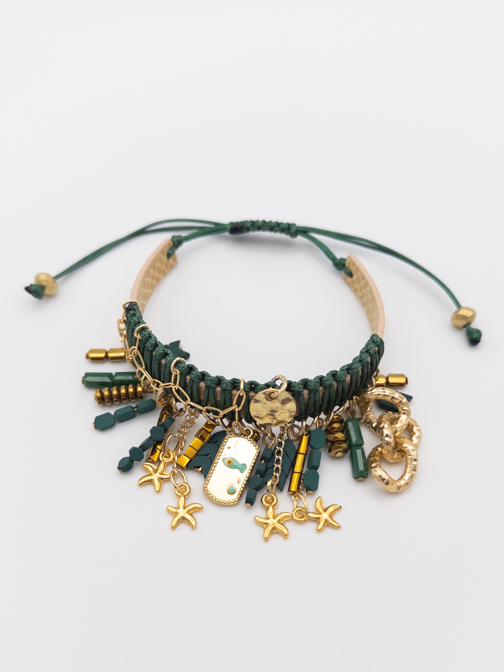 Embrace earthy elegance with this handcrafted deep green macramé anklet, featuring a mesmerizing mix of gold-tone charms, starfish pendants, and rich emerald-hued beads. Inspired by the beauty of nature and the allure of the ocean, this anklet is a timeless statement piece for those who love a blend of sophistication and bohemian charm.